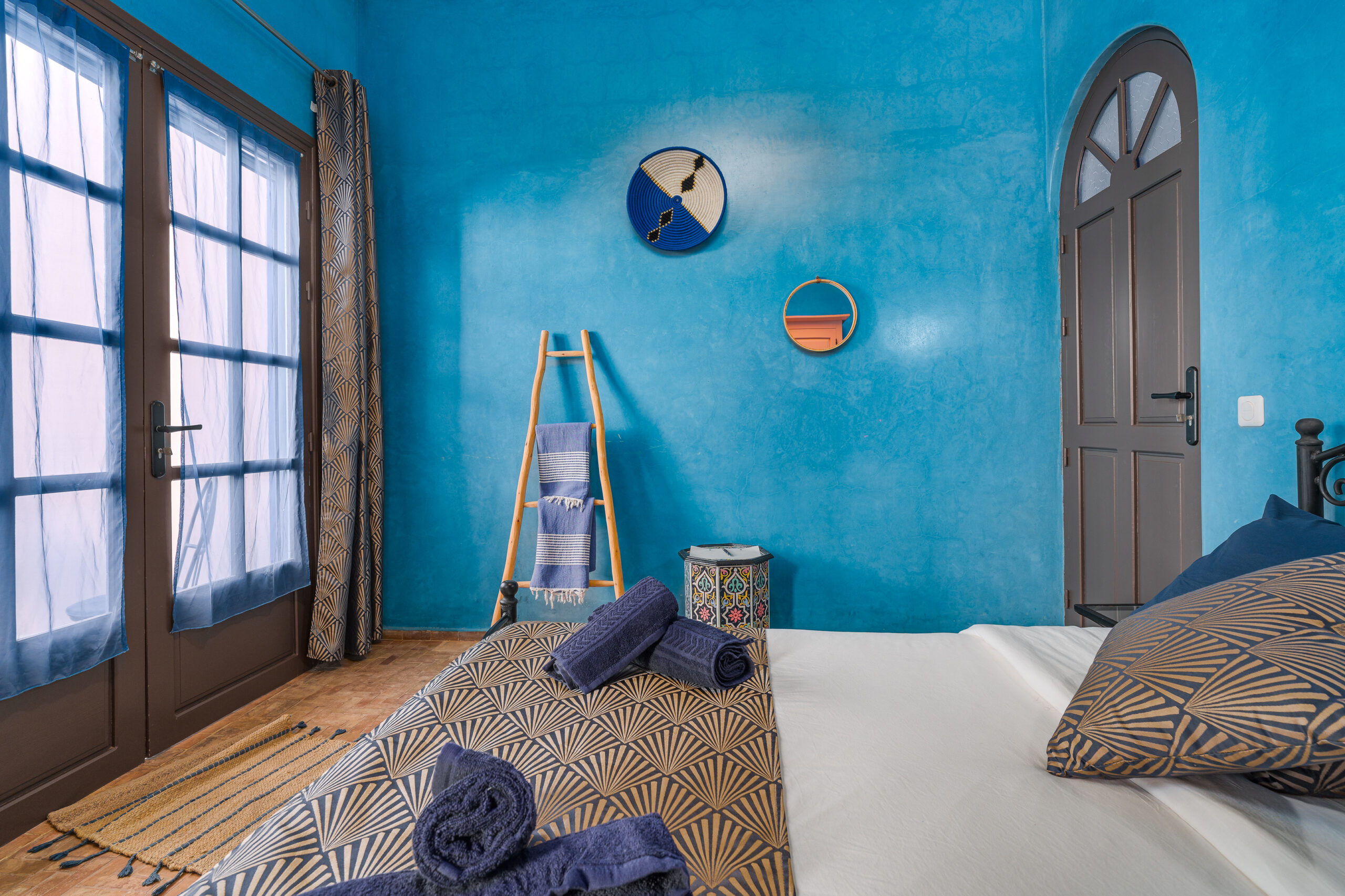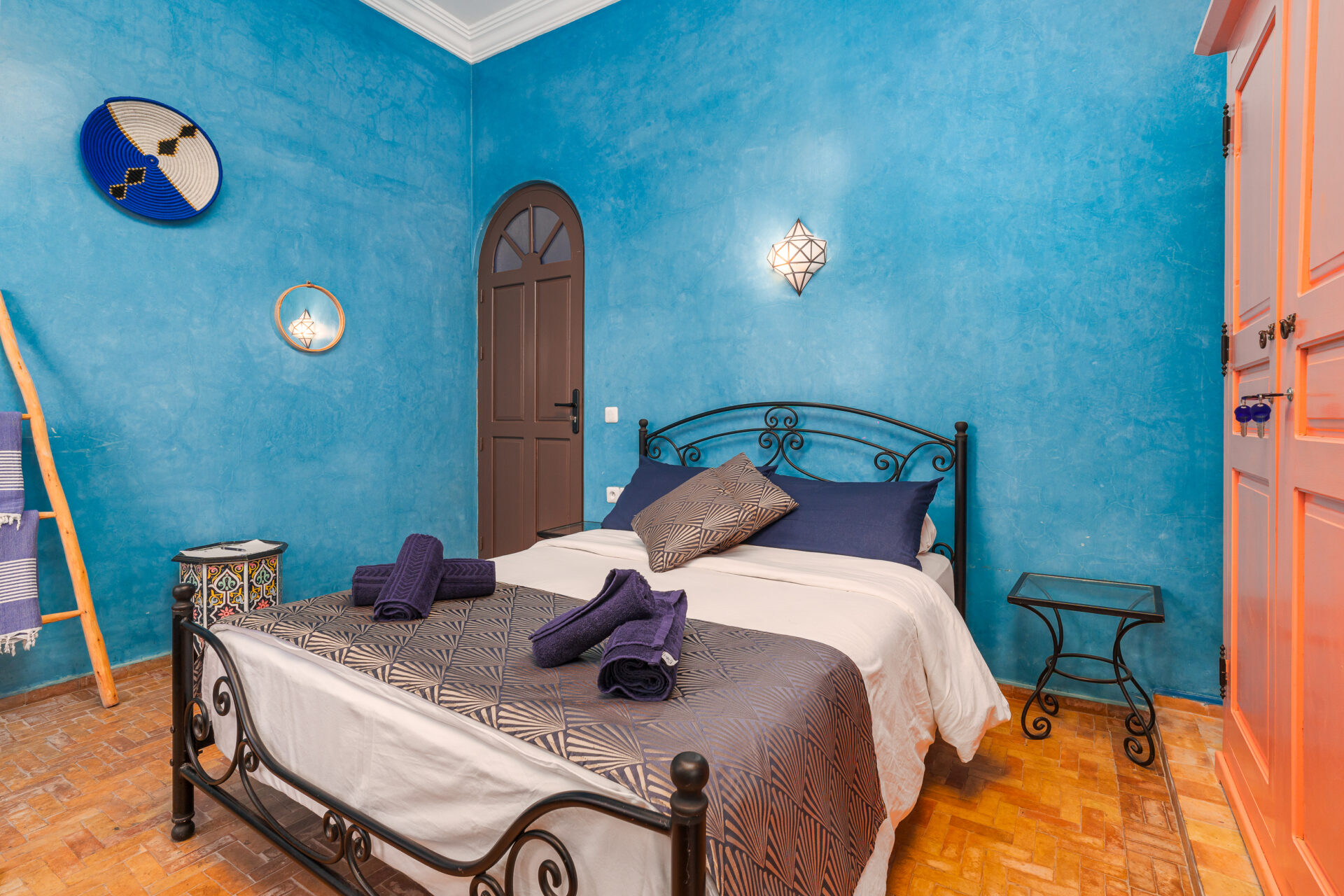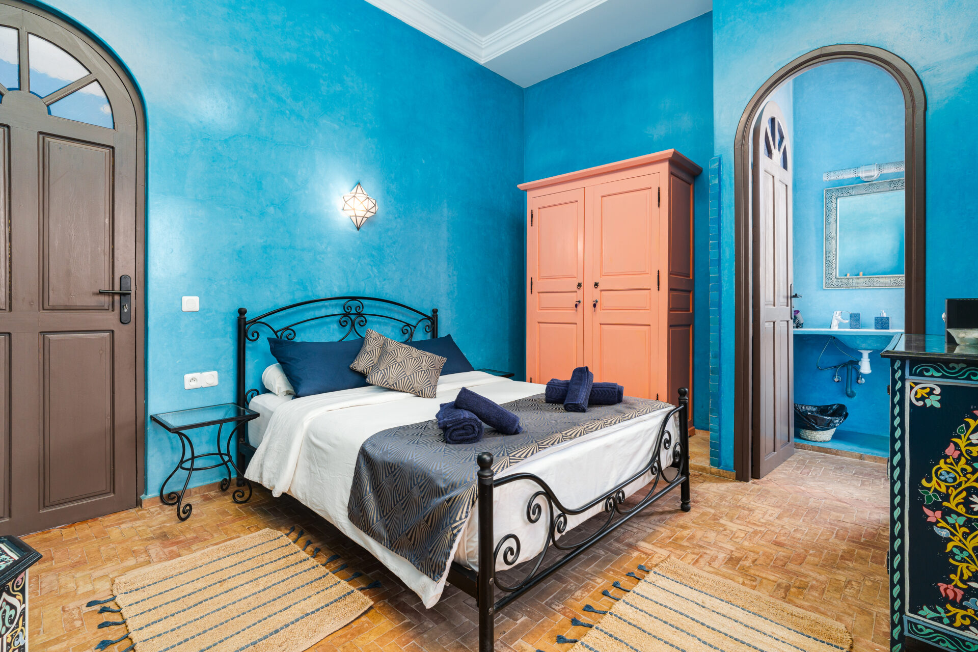 Chambre Chefchaouen pensée pour deux personnes, vous transporte dans un univers oriental inspiré de la célèbre ville bleue. Les murs se parent de bleu majorelle et de bleu pétrole, relevés par de délicates touches dorées. Le lit double et les jeux de lumière créent une atmosphère élégante, rappelant l’esprit des mille et une nuits, entre raffinement et sérénité. D’une surface de 22 m² avec salle de bains privative, cette chambre offre un cadre intime et apaisant, idéal pour un séjour tout en douceur à Dar Yanis.