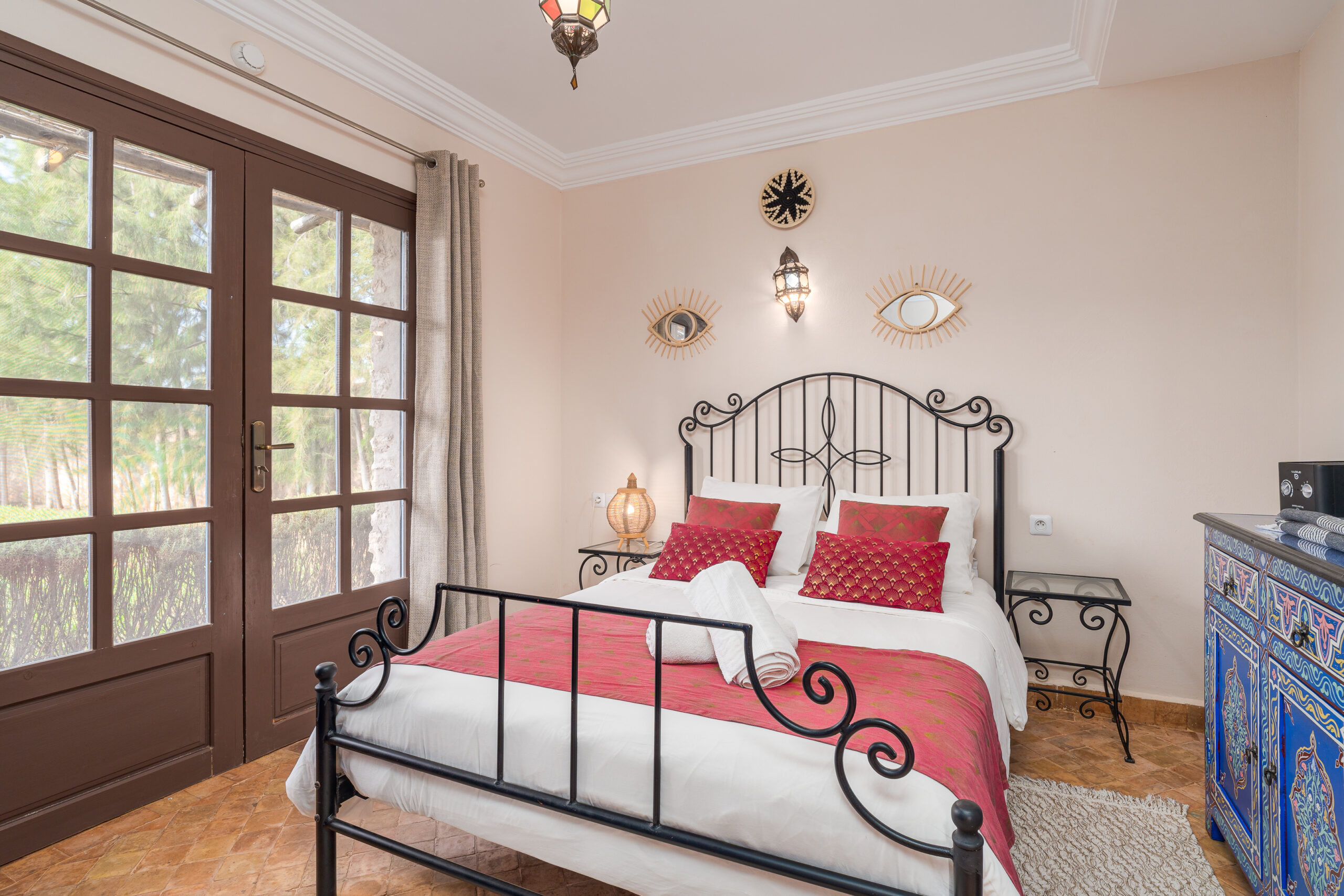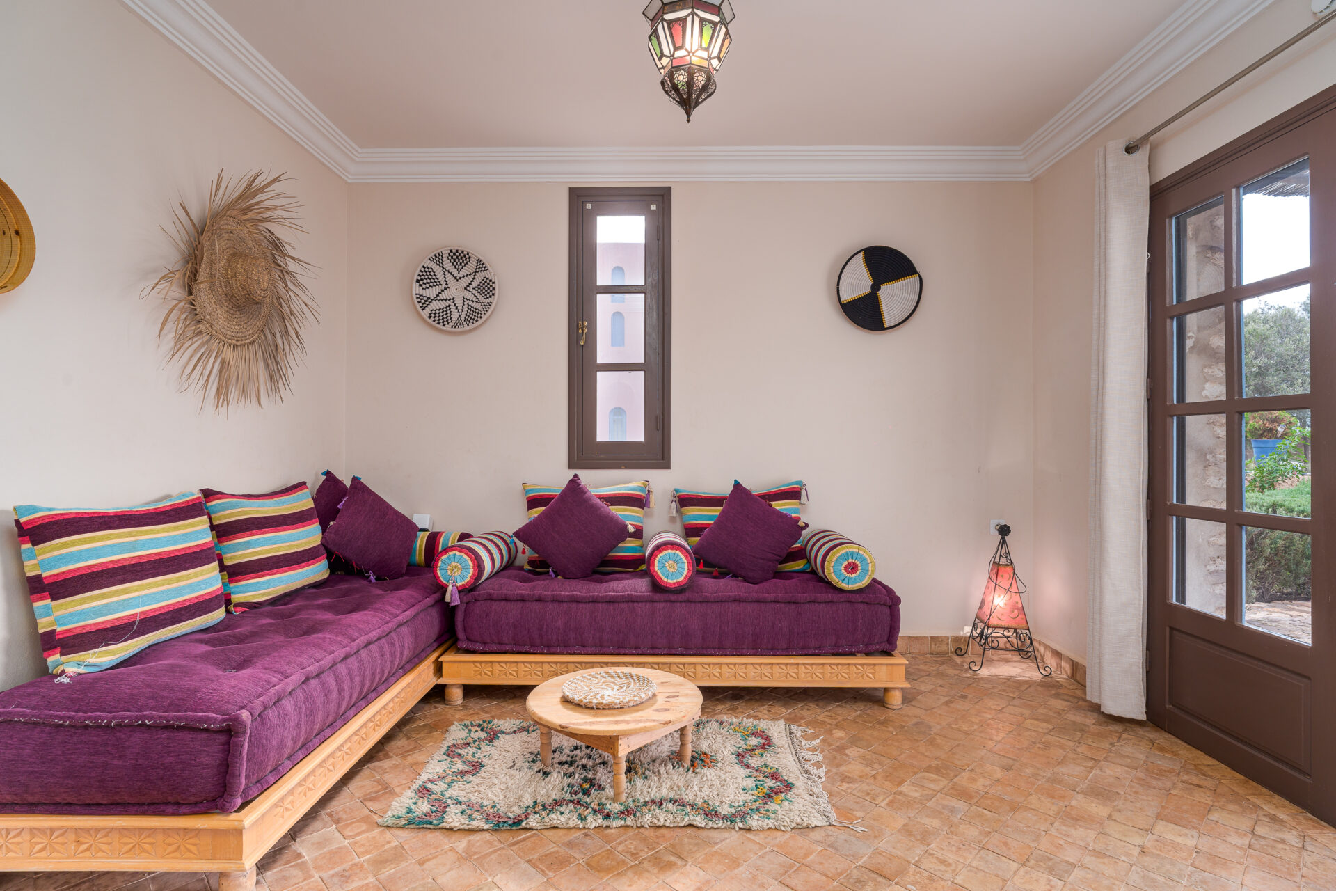 Maisonnette Atlas rustique et raffinée, se compose d’une chambre parentale et d’un petit salon berbère pouvant accueillir deux enfants. Le mélange du bleu majorelle et du rouge pourpre apporte caractère et chaleur à cet espace familial. Chaque recoin est pensé comme un cocon, idéal pour partager des moments simples dans une atmosphère authentique et apaisante. D’une surface de 56 m² avec salle de bains privative, cette maisonnette offre confort et intimité pour un séjour en famille à Dar Yanis.